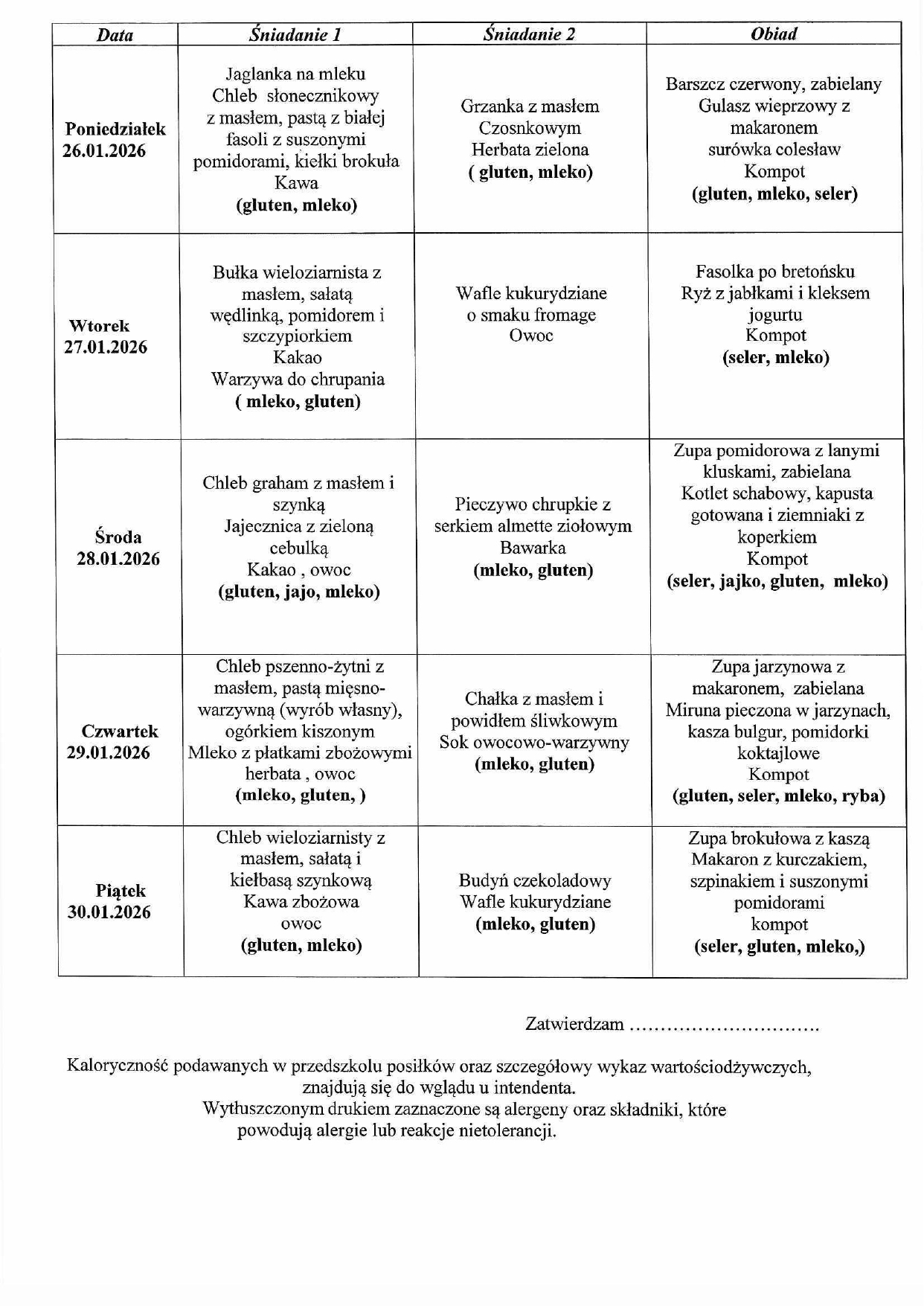Jadłospis również dostępny jest na tablicy ogłoszeń w Przedszkolu.