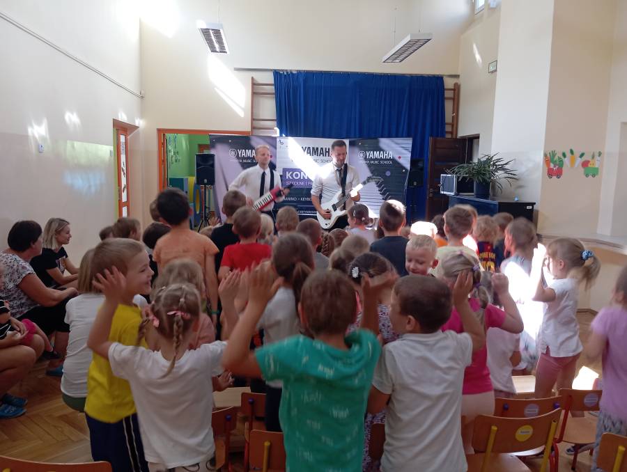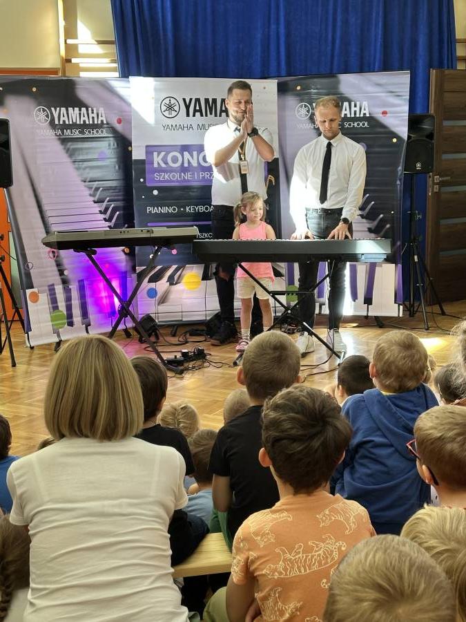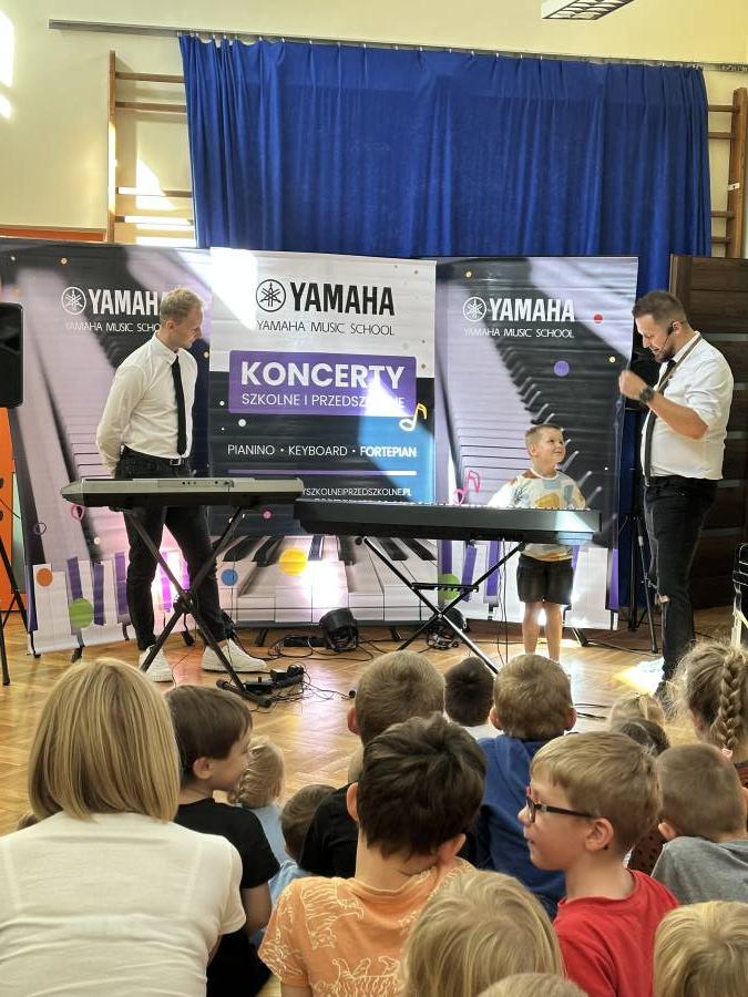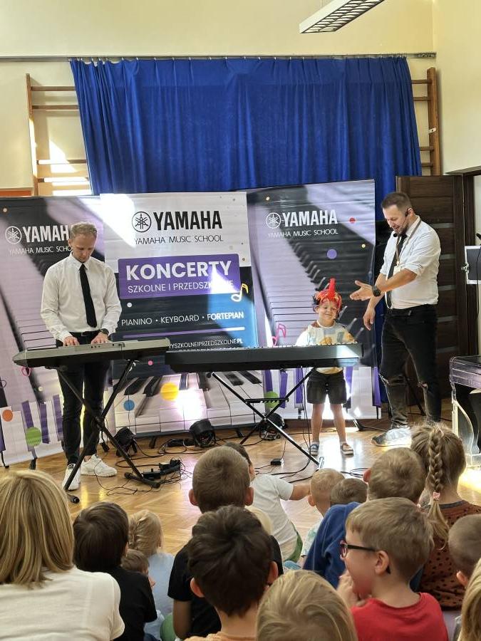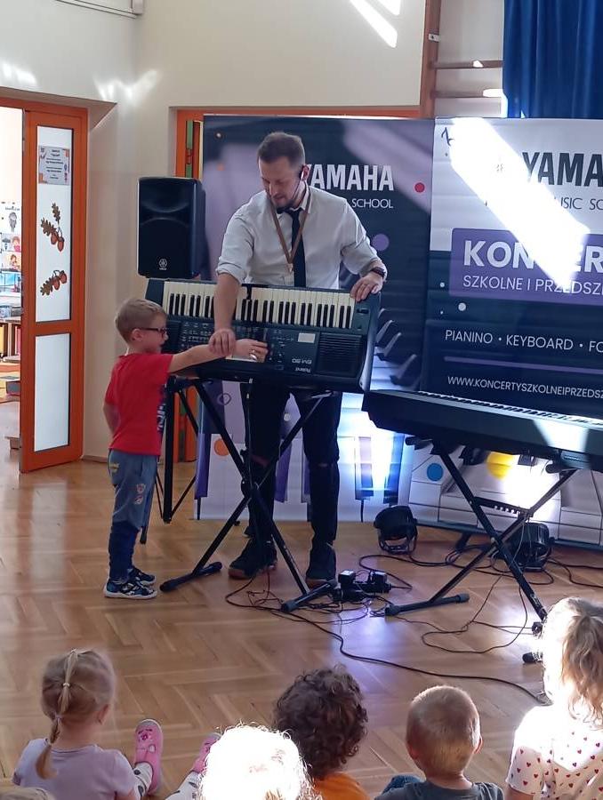 Dnia 22.09.2025 w naszym przedszkolu gościliśmy Zespół Muzyczny YAMAHA. Panowie z zespołu opowiadali nam ciekawostki o instrumentach, oraz pokazywali nam jak można wykorzystywać ich dźwięki w zabawie.