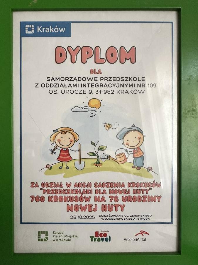 Grupy 3 i 4 wzięły udział w akcji sadzenia krokusów ,,przedszkolaki dla nowej huty'' w ramach akcji 760 krokusów na 76 urodziny Nowej Huty. Już wiosną na skwerze przy skrzyżowaniu ulic: Struga, Żeromskiego i Wojciechowskiego będzie można podziwiać nasze kwietne dzieło.