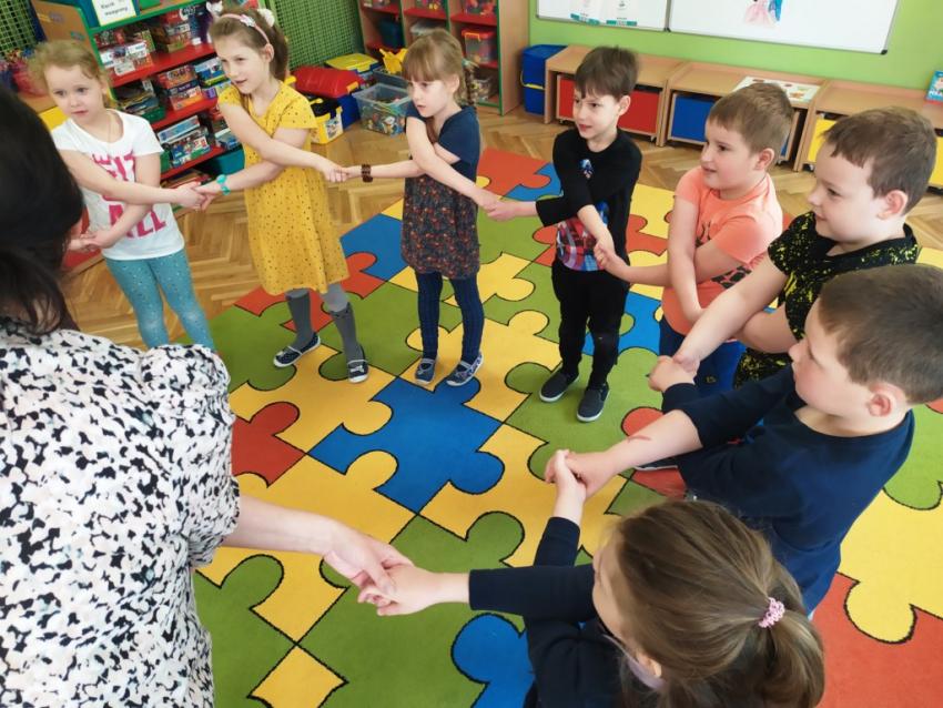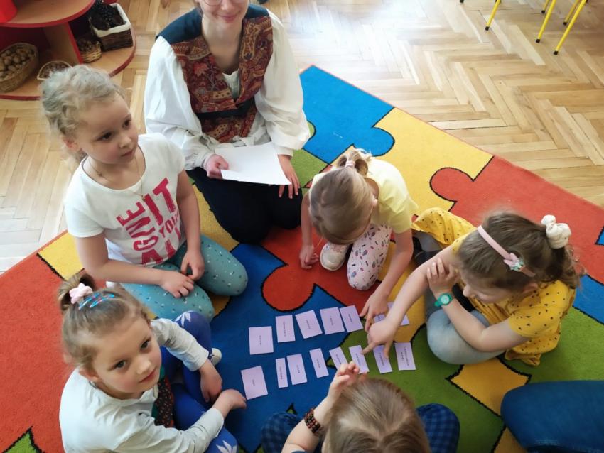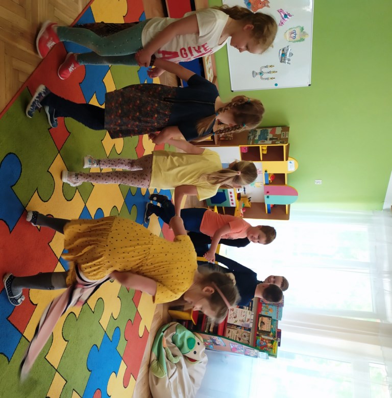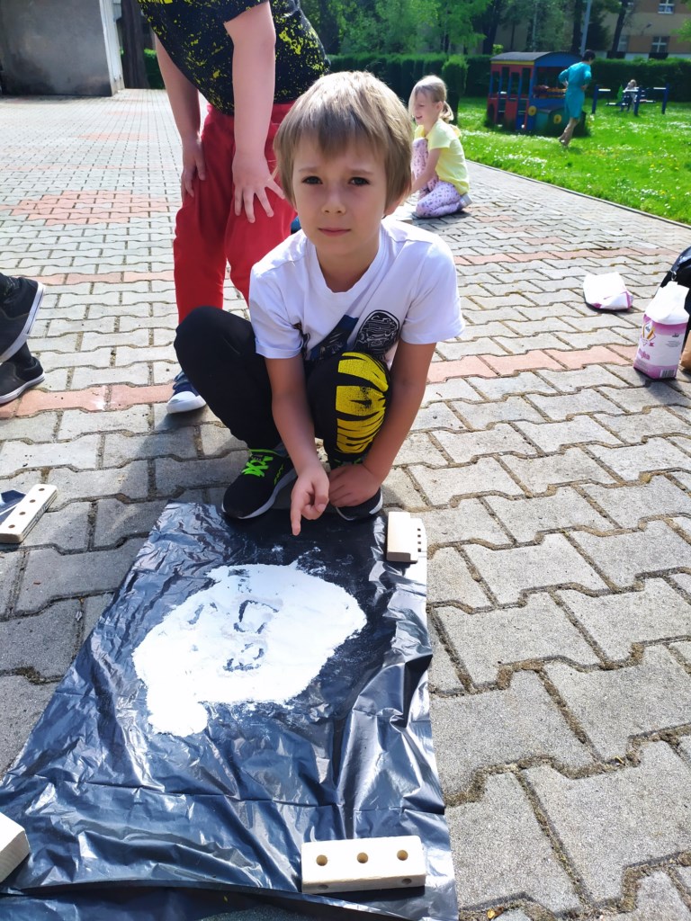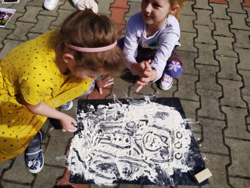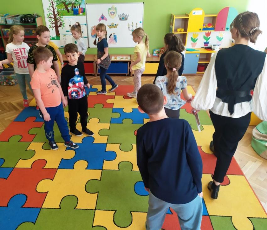 9 maja w grupie IV odbyły się kolejne zajęcia w ramach Projektu "Bajkowy Kraków w podaniach i legendach". Odwiedziła nas Pani Gabrysia Kongstad, która m.in. jest instruktorką ZHR. Z wykorzystaniem metodyki zuchowej zaprosiła nas na Bal na zamku królewskim. Dzieci podzieliły się na 3 grupy: "Bazyliszek", "Super poziomki" i "Ognisty tuptuś". Poznaliśmy zabawy dworskie np.: "Konie", "Smoki", "Hasanie po zamku", dowiedzieliśmy się kto mieszkał na zamku, a na koniec narysowliśmy ich portrety na mące:) Zabawa była fantastyczna, wykorzystaliśmy również sprzyjające warunki pogodowe i część zabaw zrealizowaliśmy na przedszkolnym tarasie.