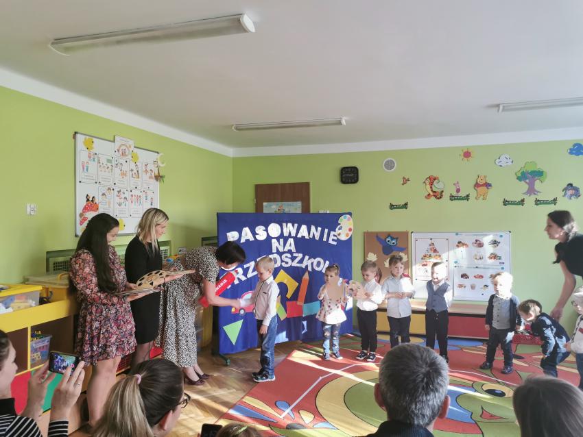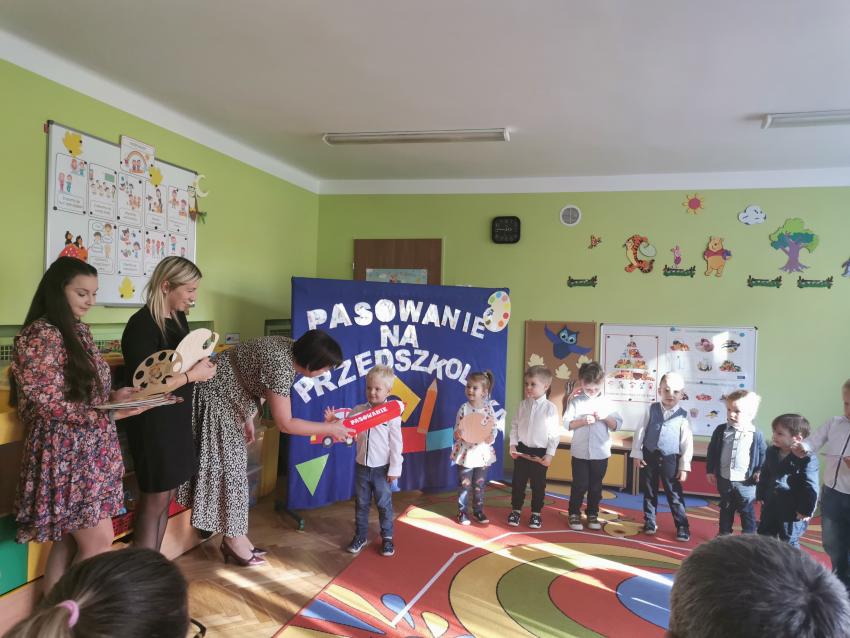 Dnia 20.10.2022r w naszym przedszkolu odbyło się Pasowanie na Przedszkolaka. Był to szczególny dzień dla dzieci z grupy I, które we wrześniu po raz pierwszy przekroczyły próg przedszkola. Dzieci zaprezentowały wierszyki oraz piosenki, które stanowiły część artystyczną wydarzenia. Zaprezentowane przez dzieci umiejętności dały dowód na to, jak dużo już potrafią. Nasi mali artyści zasłużyli na wielkie brawa i gratulacje ! Wszystkim dzieciom życzymy wielu sukcesów, nowych przyjaźni i dużo uśmiechu !
