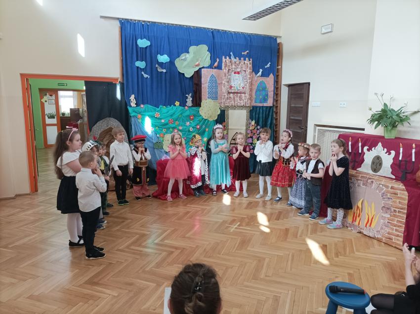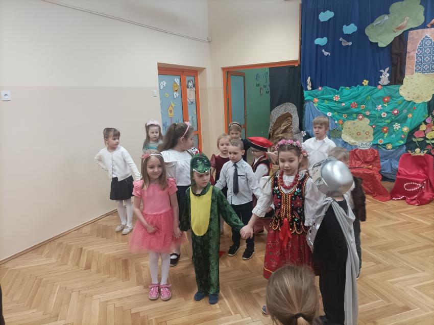 28 marca, wtorek, dzieci z grupy III przygotowały dla społeczności przedszkola niezwykłe przedstawienie. "Zakochany Smok Łakomczuch" postanowił zmienić dietę na taką, w której jest więcej sałatek i poprosił królewnę o rękę. Takiego zakończenia chyba nikt się nie spodziewał ???? oczywiście nie zabrakło tańców w ty najważniejszego czyli poloneza.