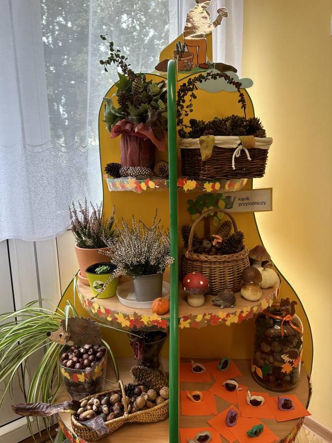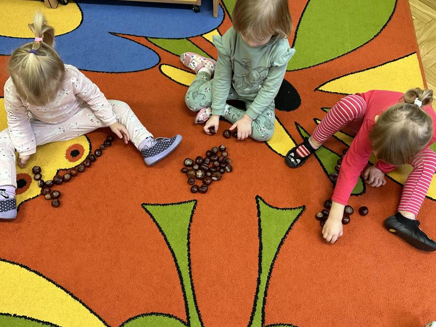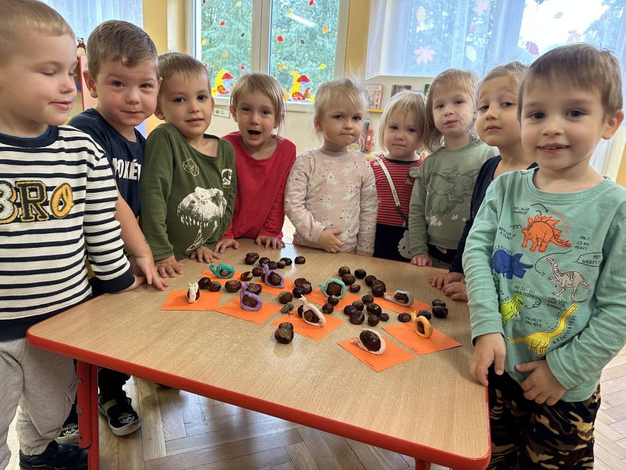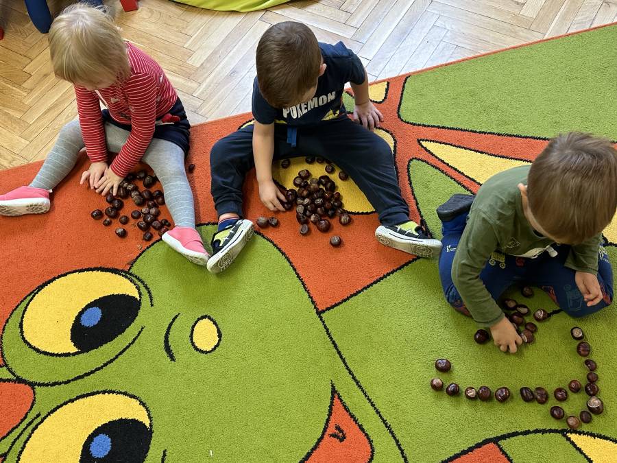 Z darów jesieni układaliśmy ?dywanowe kompozycje?. W kąciku przyrody pojawiły się nasze ślimaki z ?kasztanowym domkiem?.