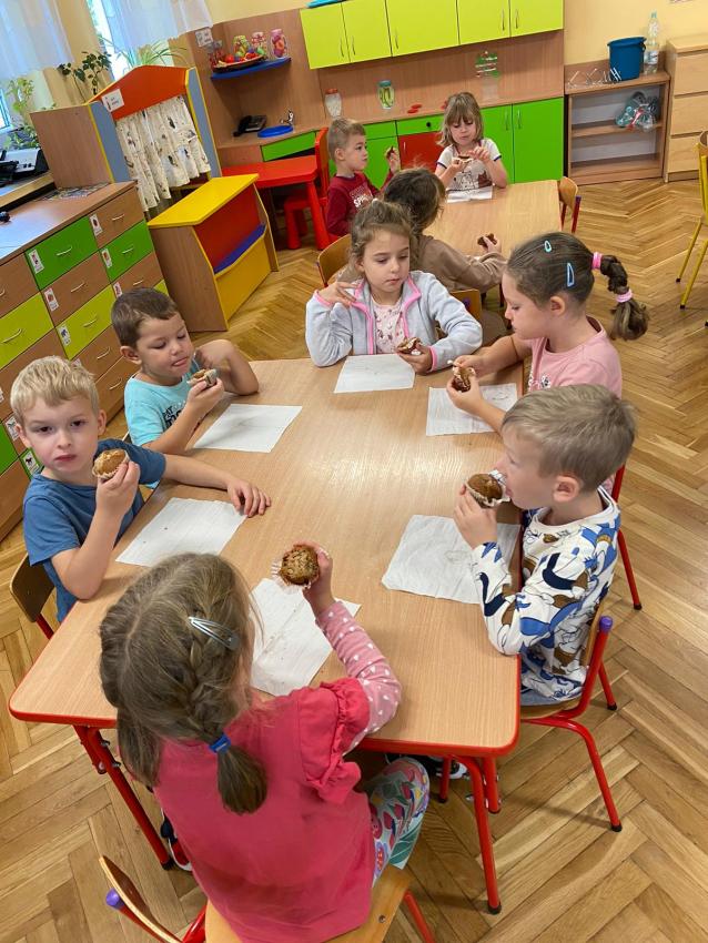 Przepiękne drzewo, które ozdobiło nam salę wykonała mama Leona Ku. Na nim zawisły piękne drewniane jabłuszka ( które wyciął dla nas tata Leona Ka. ) W takich okolicznościach, niczym w prawdziwym sadzie minął nam tydzień w którym poznaliśmy wiele ciekawostek o tych pysznych owocach. Skosztowaliśmy dwie szarlotki i dwie tury muffinek jablkowych. ( mama Agatki, mama Leosia Ka i mama Leosia T. Upiekły dla nas te pyszności.) W naszym sadzie nie zabrakło wielu odmian przepysznych jabłek. ( za co serdecznie dziękujemy mamom; Filipa, Liliany i Oli ). Próbowaliśmy smaków jabłuszek, zrobiliśmy też samodzielnie z nich sok. Dziękujemy też mamie Milenki :).