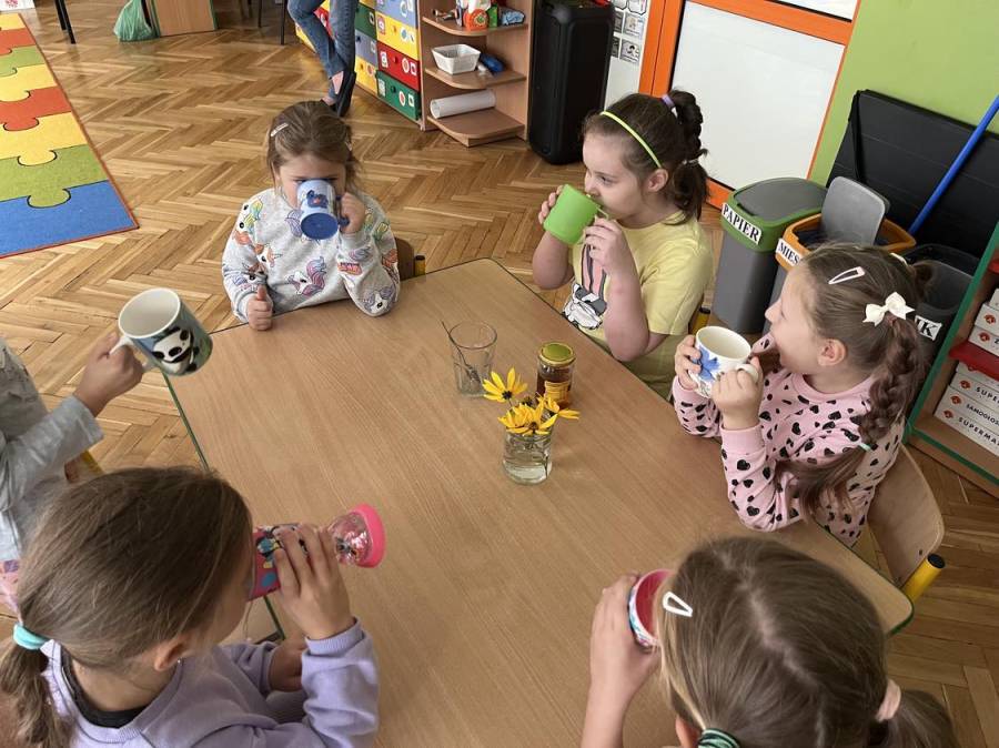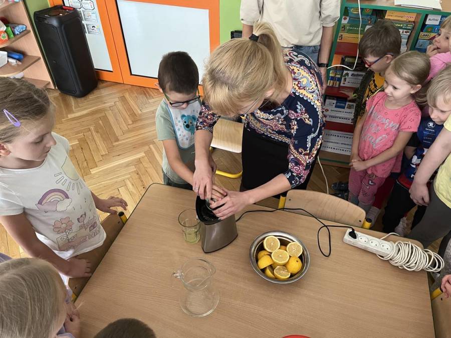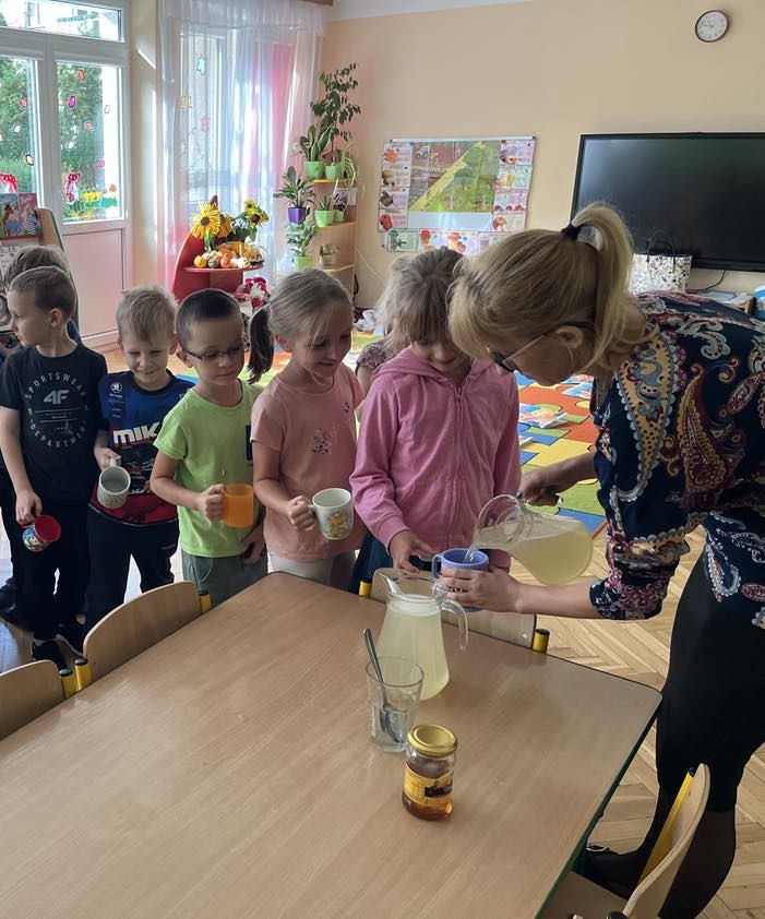 Starszaki uwielbiają zajęcia kulinarne. Przy okazji realizowania treści z zakresu "W sadzie i w ogrodzie", przygotowaliśmy pyszną i zdrową lemoniadę cytrynową. Przepis jest bardzo prosty. Wycisnęliśmy sok z 1 kg cytryn. Jakież było nasze zdziwienie, gdy zobaczyliśmy jak niewiele soku udało się uzyskać. Następnie połączyliśmy go z wodą oraz do każdego dzbanka dodaliśmy po 2 łyżki pysznego miodu. Spróbujcie sami w domu z rodzicami.