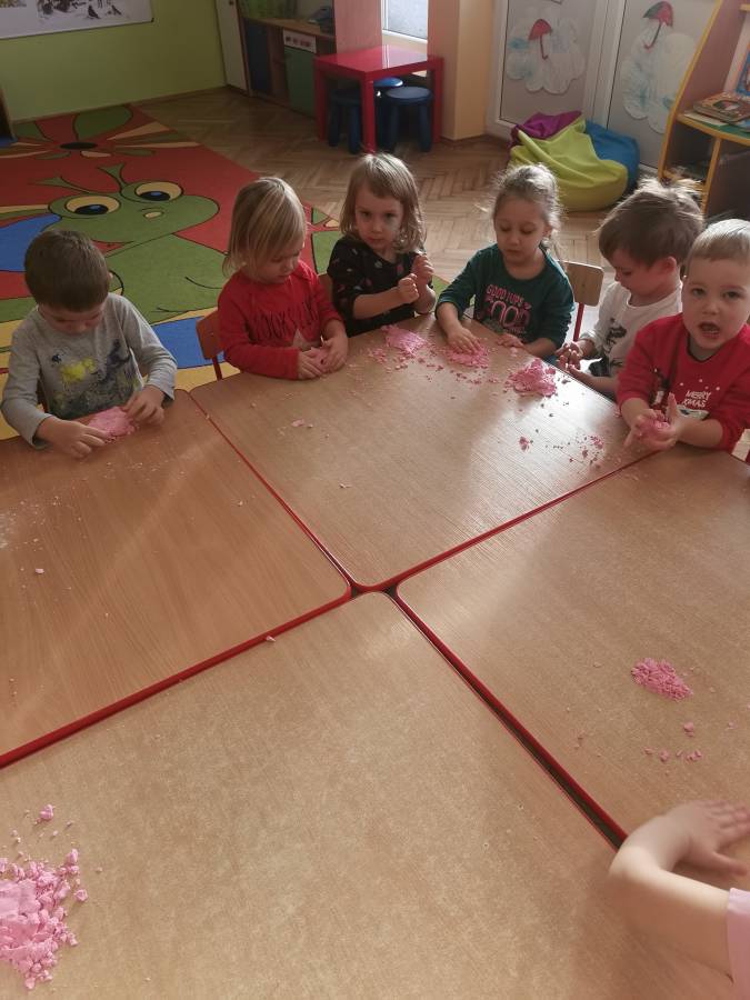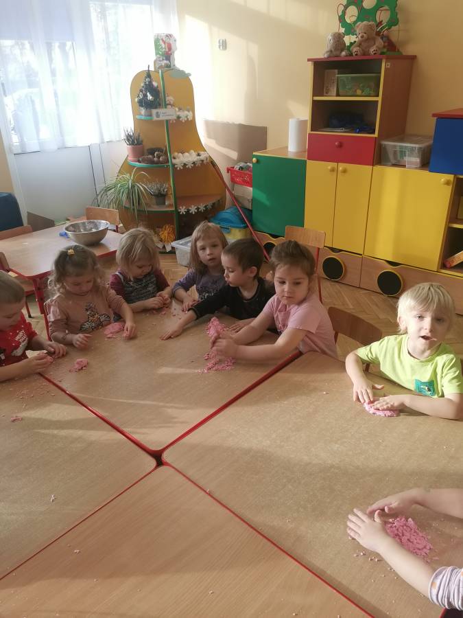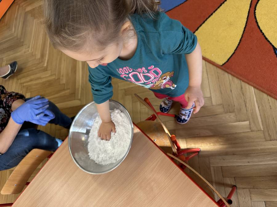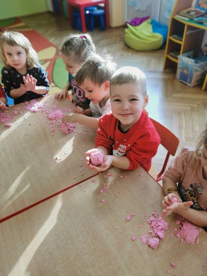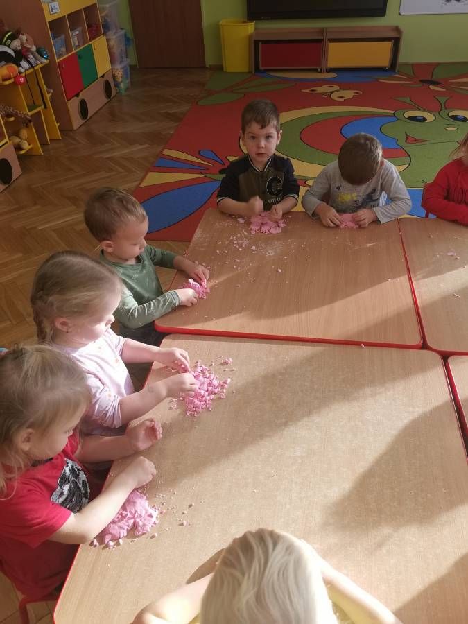 W ramach projektu ?Gramy zmysłami? przygotowaliśmy masę plastyczną ?piankolinę?. Zabawa z różnego rodzaju masami, które można samodzielnie wykonać w domu, rozwija umiejętności manualne i manipulacyjne, doskonali precyzję rąk, usprawnia koordynację wzrokowo - ruchową, pobudza zmysł dotyku przez stymulację czucia powierzchniowego i głębokiego.