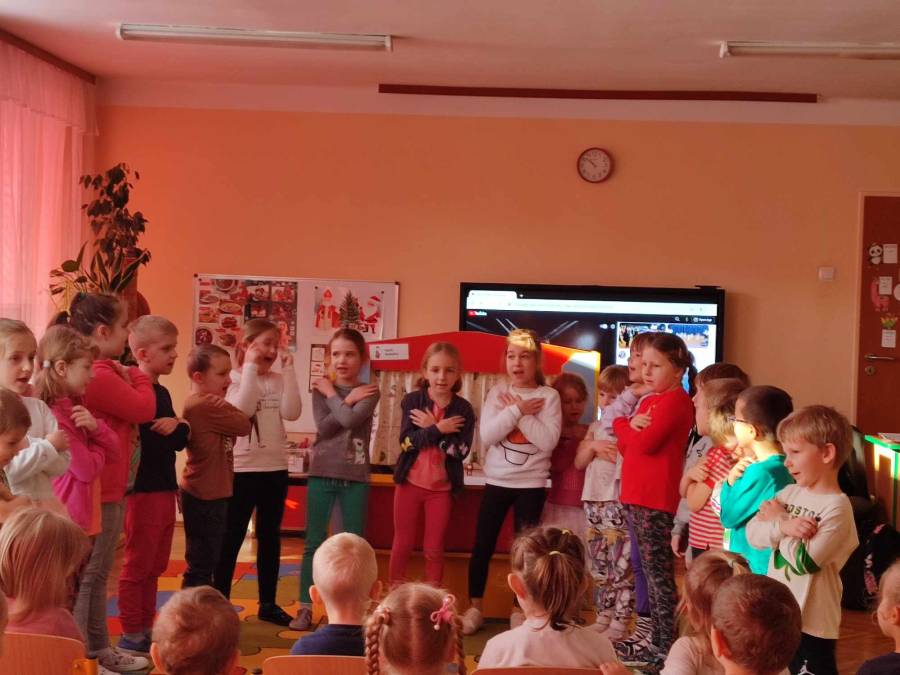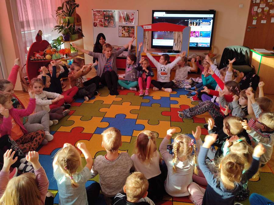 5 grudnia, dzieci z grupy IV zaprosiły swoich młodszych kolegów i koleżanki z grupy I do swojej sali. Przygotowały dla nich teatrzyk kukiełkowy "Smoczy karnawał". Po występie, zaprosiliśmy naszych gości do wspólnych ćwiczeń, którymi nie pogardzi żaden aktor oraz poczęstunku. Miło spędziliśmy razem czas.