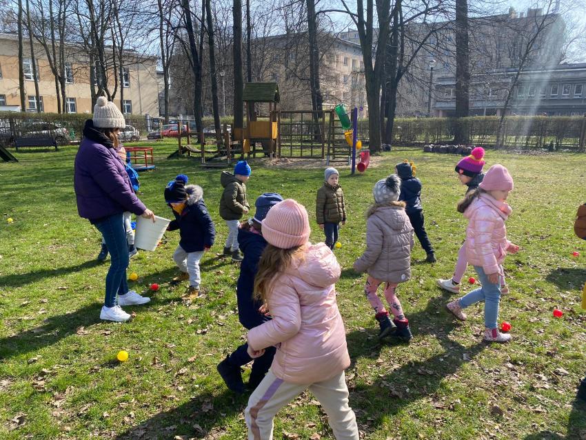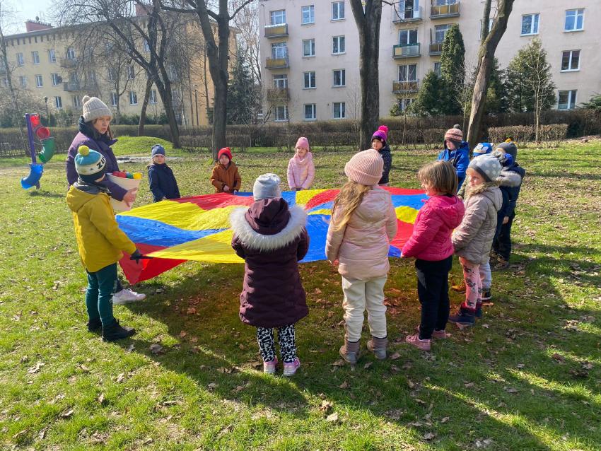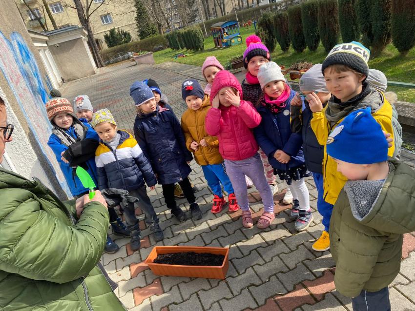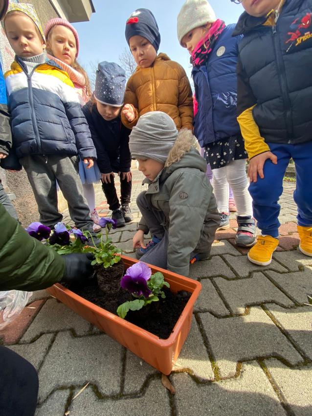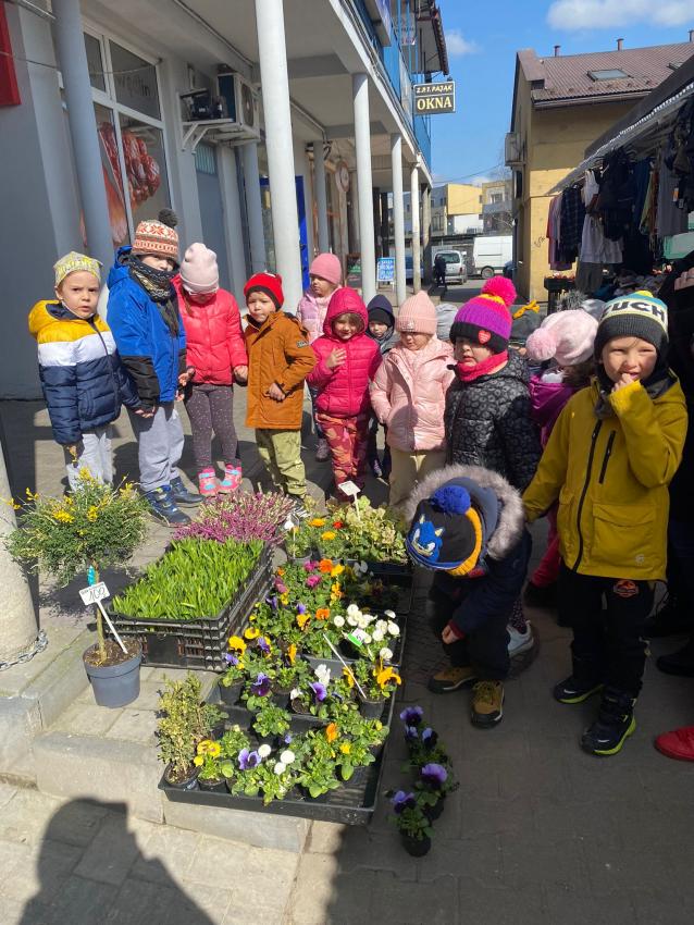 Tak przywitaliśmy Wiosnę. Wybraliśmy się na pobliski targ, aby zakupić sadzonki, które zasadziliśmy w doniczce na tarasie. Wesoło bawiliśmy się w ogrodzie zbierając piłeczki- wiosenne, kolorowe kwiaty.