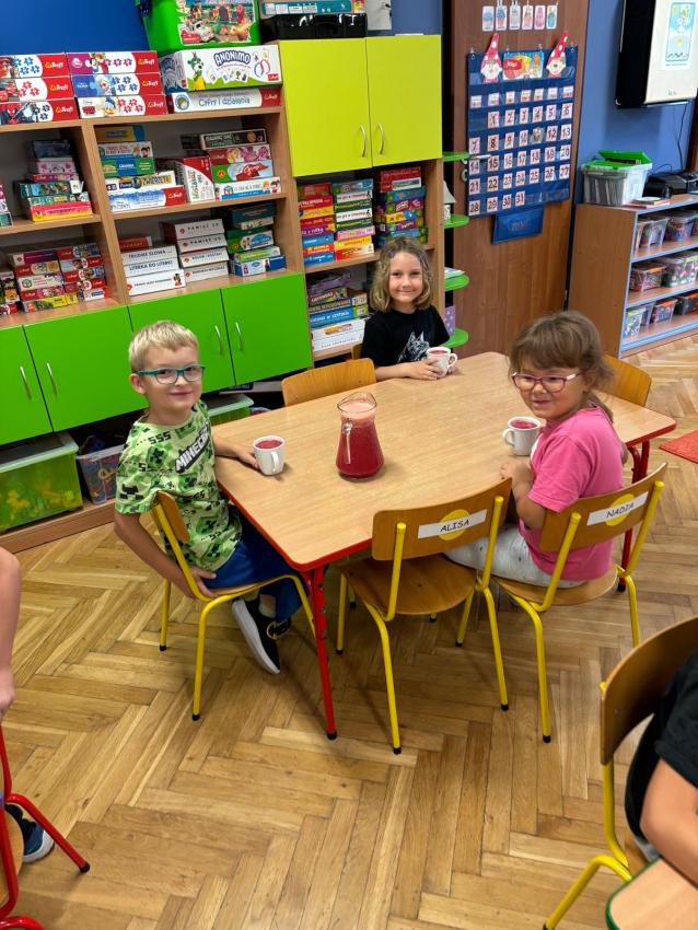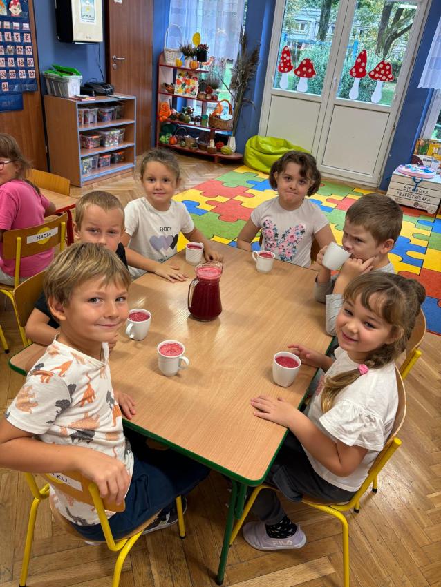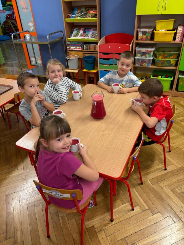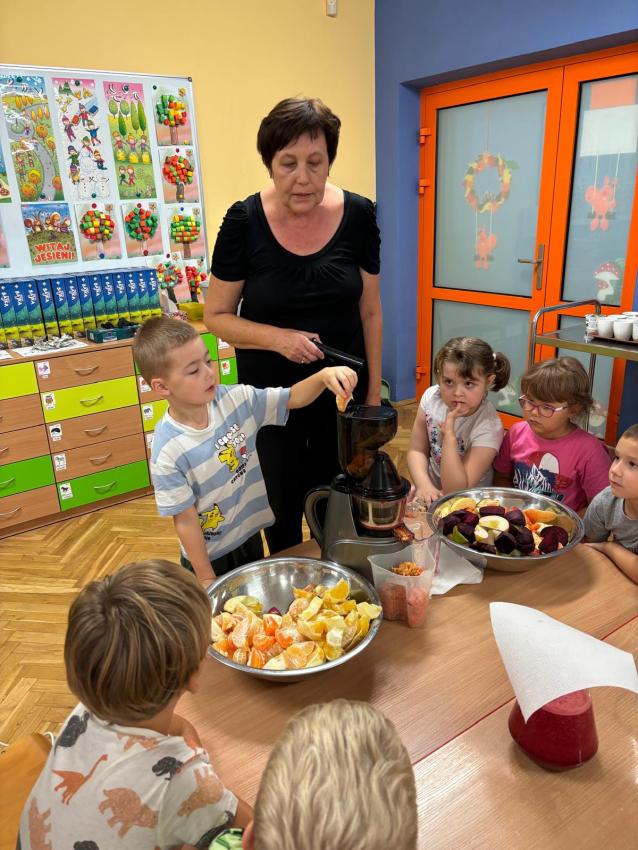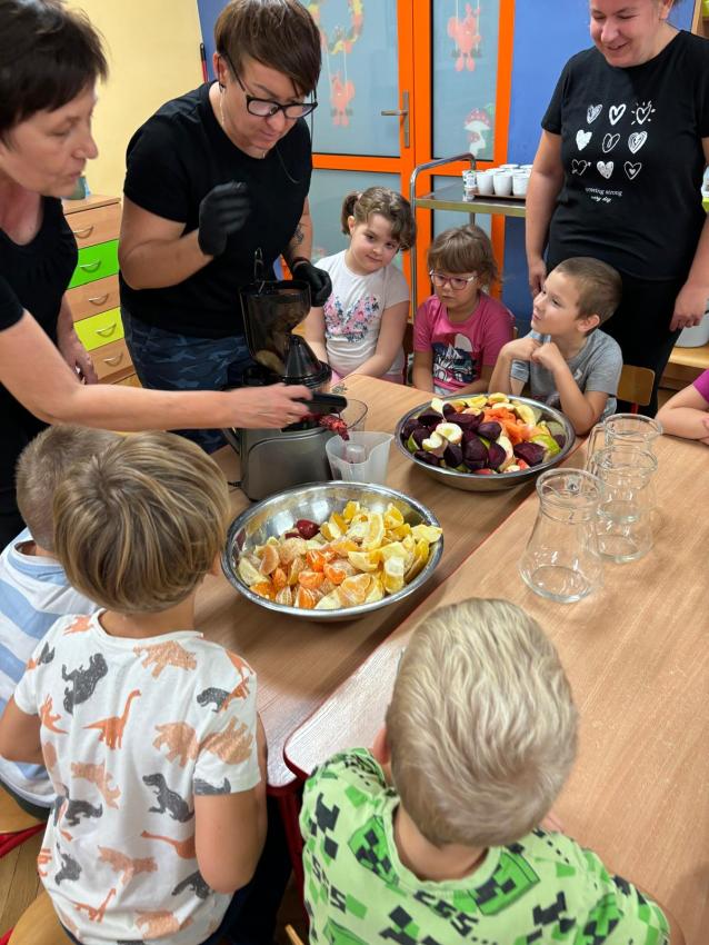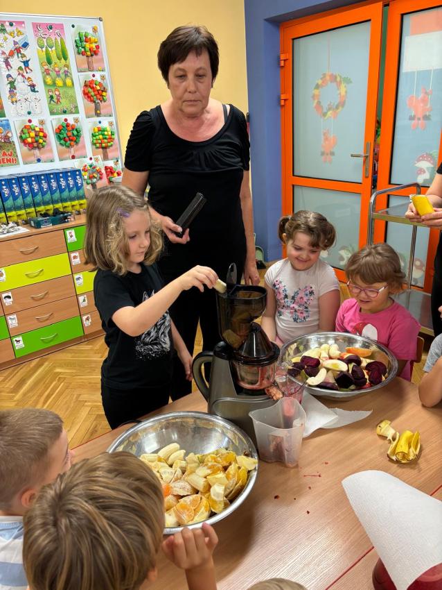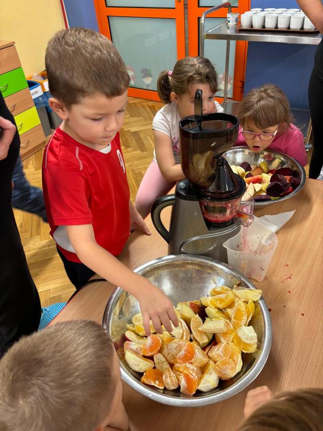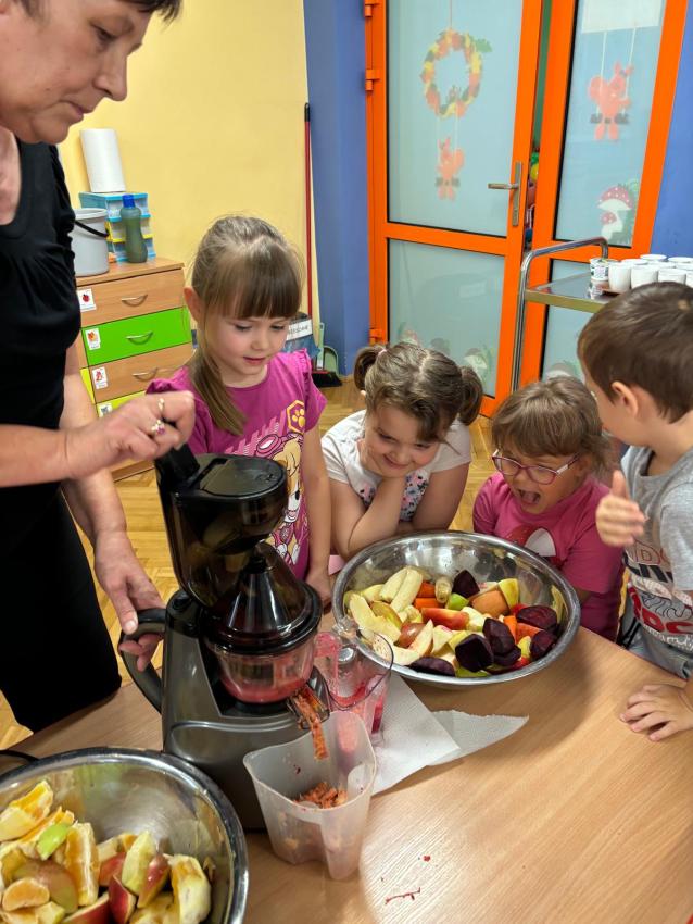 Dzieci z grupy 4 dobrze wiedzą, że aby być zdrowym trzeba się dobrze odżywiać. Należy jeść i pić dużo soków z warzyw i owoców ( cukru dodawać nie potrzeba bo owoce same w sobie są słodkie), które mają najwięcej witamin. Z myślą o pysznych witaminach sami wyczarowaliśmy pyszny sok z warzyw i owoców, które dzieci przyniosły do przedszkola.