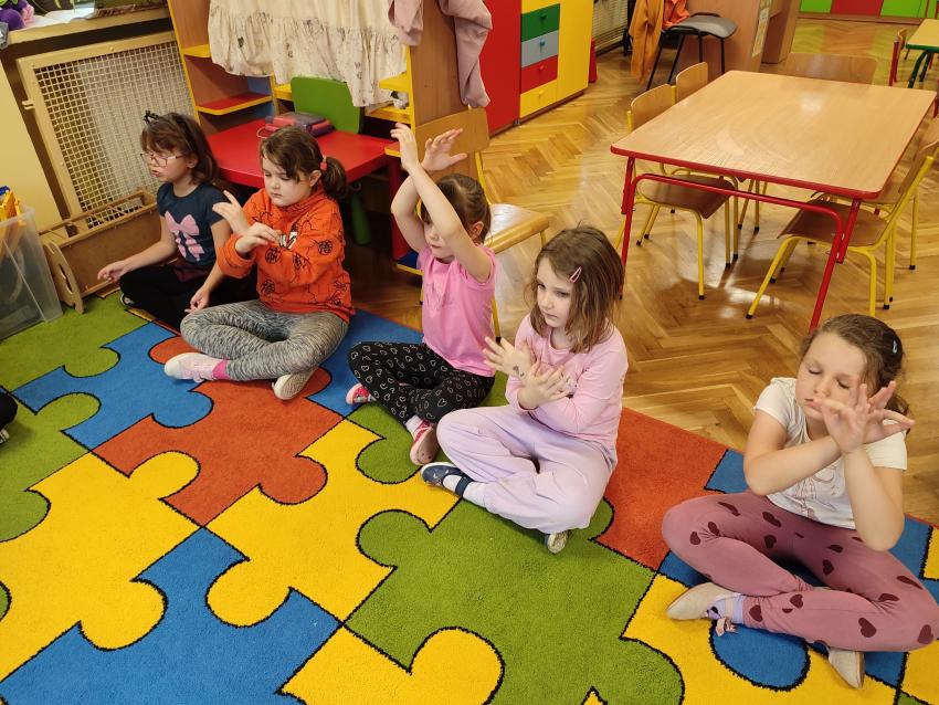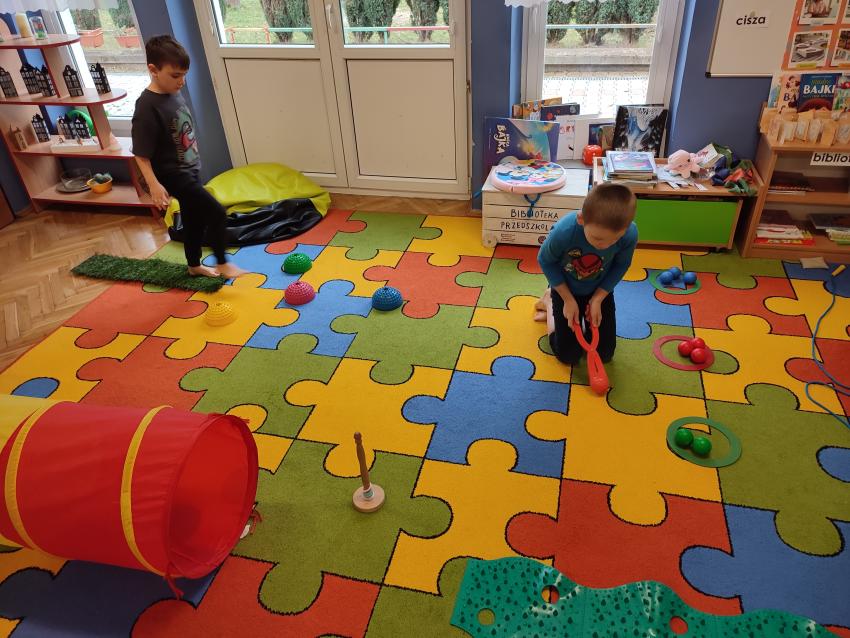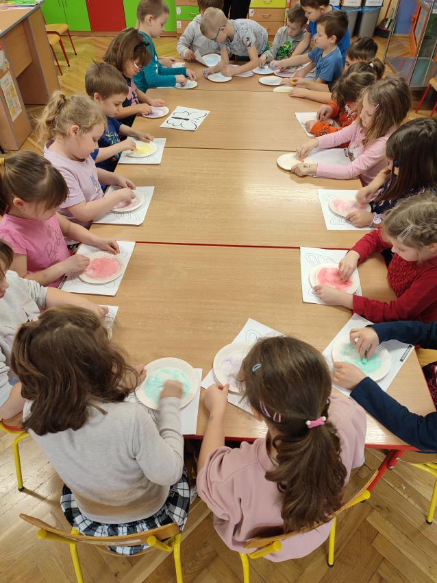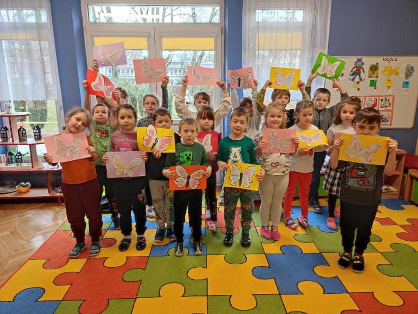 Dzieci z grupy IV w ramach innowacji ,,Sensoryka dla smyka" wykonały wielobarwne motyle. Prace wykonały techniką barwienia soli przez kredę. Dzieci pocierając kredą w różne strony sprawiły, że sól stopniowo przyjmowała kolor ścieranej kredy. W naszej sali dzieci z radością przechodziły przez ścieżkę sensoryczną. Celem zabawy było stymulowanie poszczególnych zmysłów, a zwłaszcza dotyku.