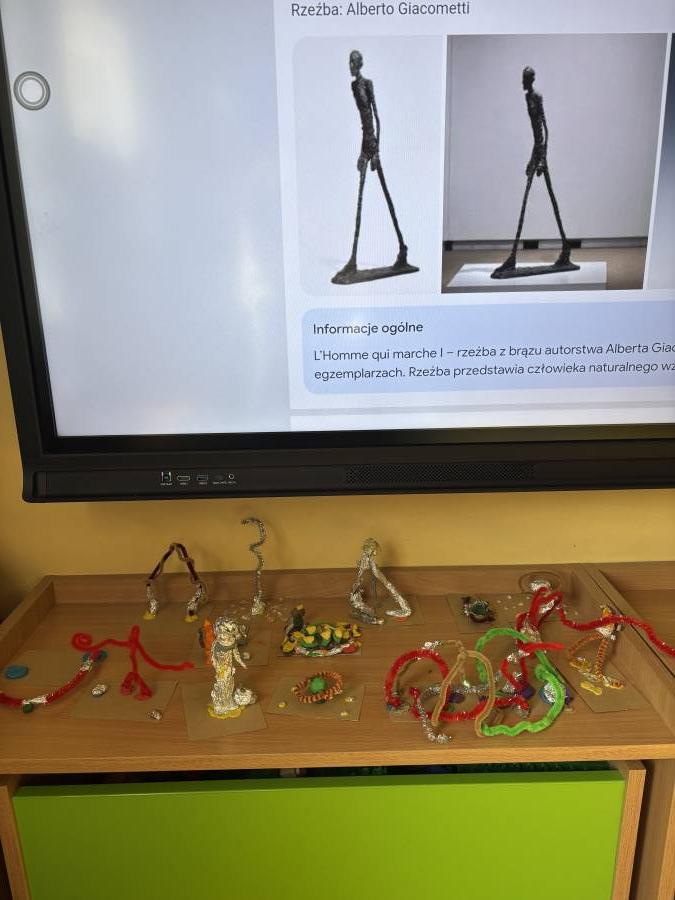 Zainspirowani dziełami Haringa tworzyliśmy dzieła z własnych ciał. Zainspirowani dziełem A. Giacometti - Idący człowiek- stworzyliśmy własne rzeźby. Stworzyliśmy również "szybki obraz? pracując wspólnie w grupach.