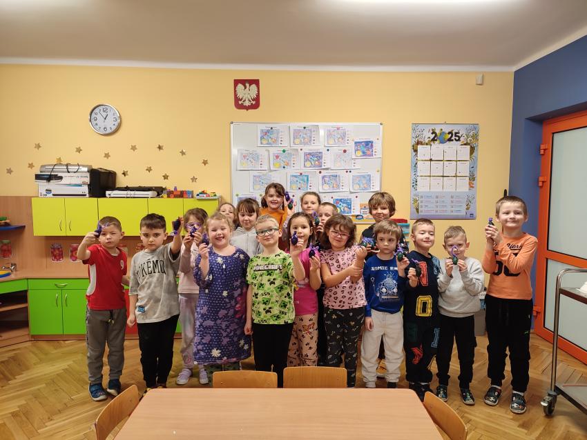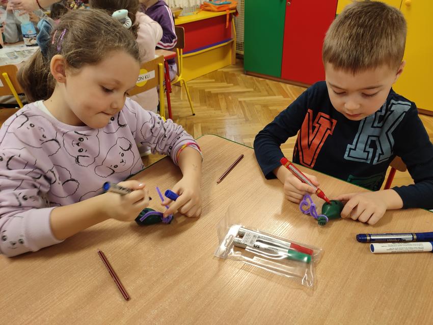 Kolejnym zadaniem projektowym było wykonanie przez dzieci gniotków sensorycznych. Te sensoryczne zabawki do ściskania, rozciągania są przyjemne w dotyku, ćwiczą palce i siłę nacisku. Pomagają w odstresowaniu się i poprawiają humor. Pod koniec zajęć dzieci opisywały swojego gumowego ludka i nazywały go. Nowa zabawka sprawiła dzieciom wiele radości i będzie wsparciem przy rozładowaniu negatywnych emocji.