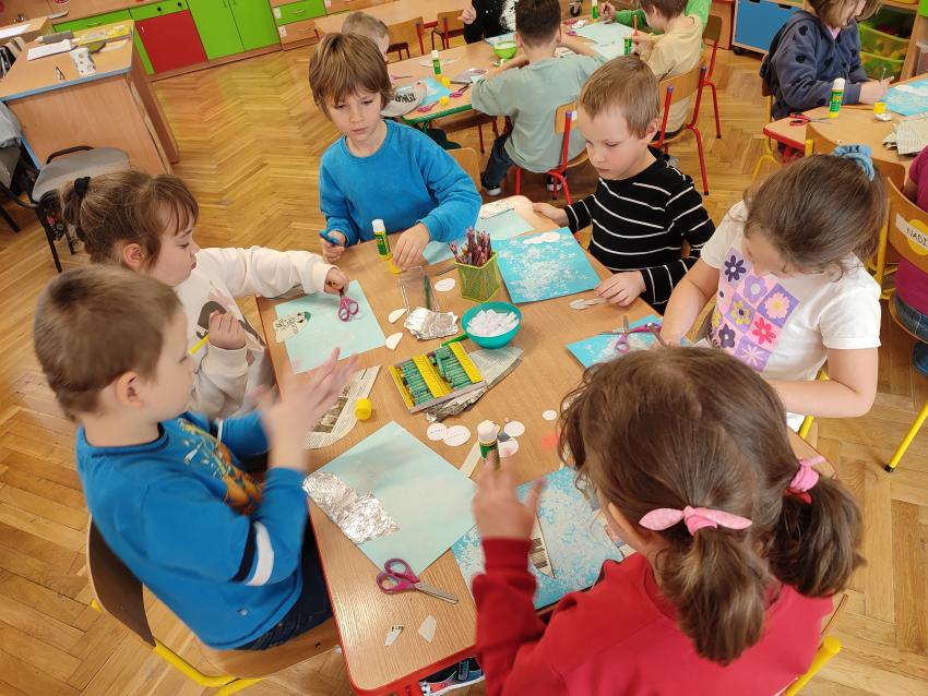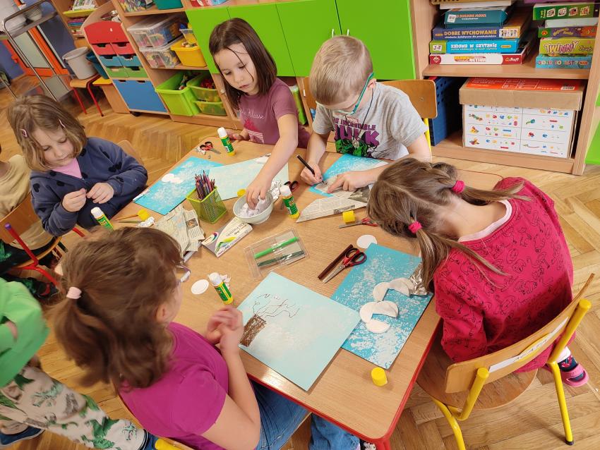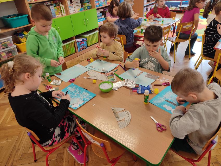 W ramach innowacji pedagogicznej ,, Sensoryka dla smyka " dzieci z grupy IV przeniosły się do zimowej krainy sensorycznej. Za pomocą różnorodnych materiałów plastycznych o różnej fakturze dzieci wykonały prace pt: ,, Zimowa kraina sensoryczna "