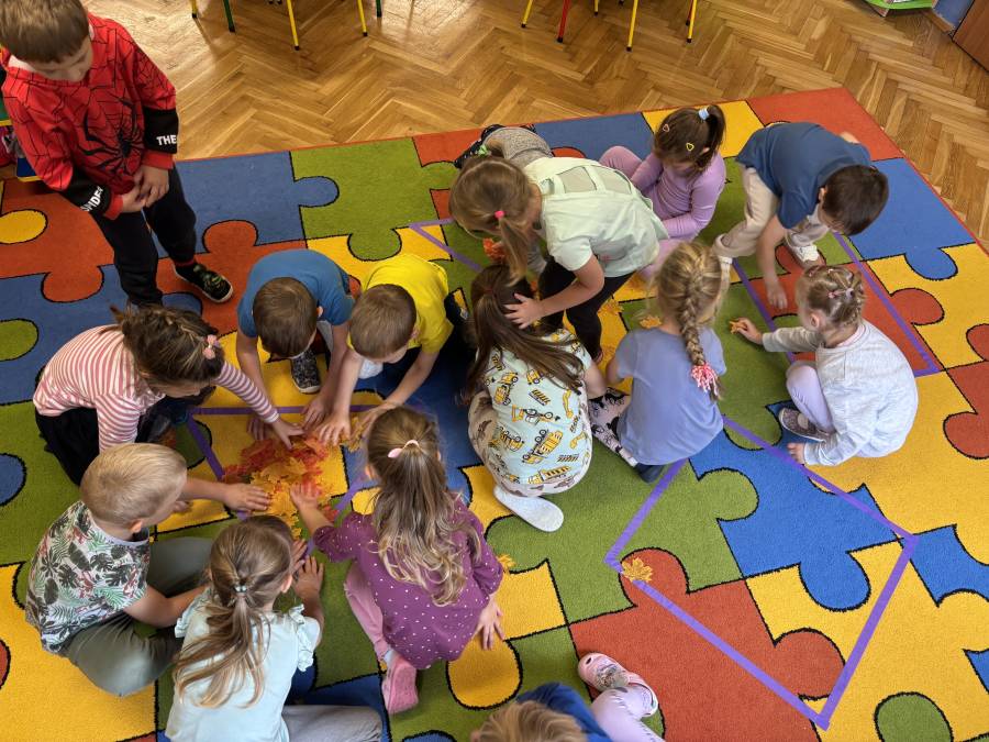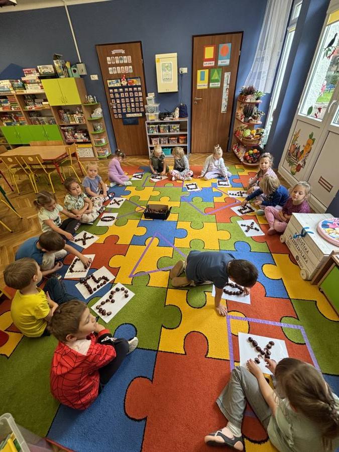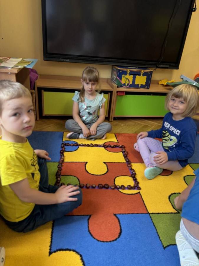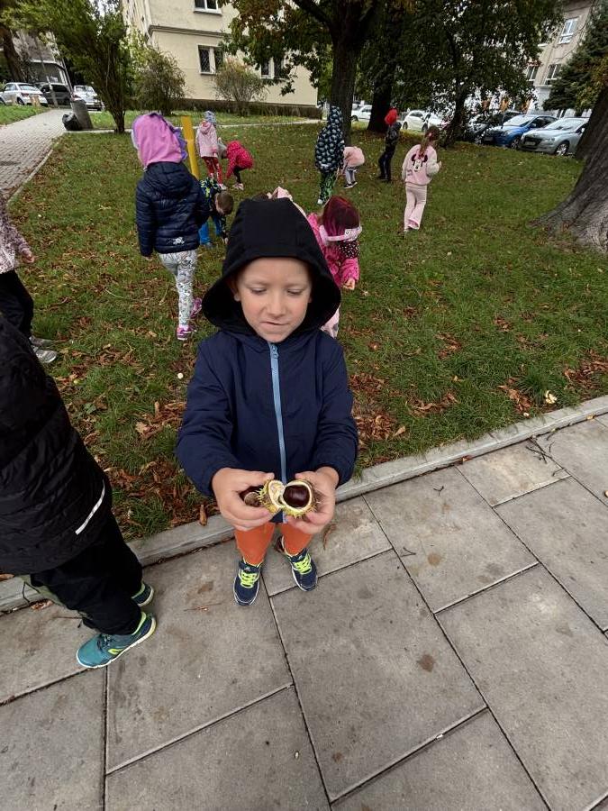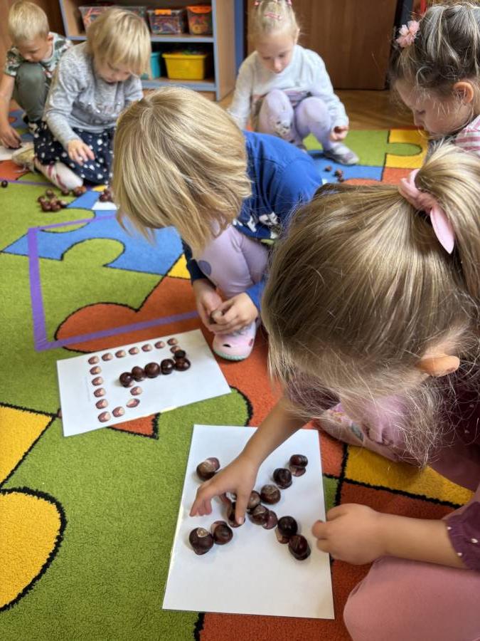 Znalezione podczas spaceru dary jesieni w postaci kasztanów wykorzystujemy do zadań i zabawy.