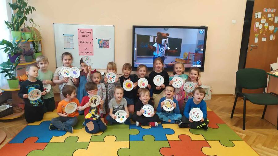 Dzieci z grupy IV zrealizowały kolejne zadanie w ramach projektu: Każdy inny-wszyscy równi. Tym razem zorganizowaliśmy Światowy Dzień Cukrzycy. Wiemy, że to jedna z wielu chorób, którymi nie zaraża się jak zwykłym katarem:) Sympatyczny Miś Radek ze Słodkiej Jedynki opowiedział nam kilka ciekawych faktów o cukrzycy. Czy wiedzieliście, że zwierzęta też na nią chorują? Zaprojektowaliśmy przykładowe dania dla diabetyków. Najbardziej jednak podobała nam się degustacja przysmaków bez cukru. Jakież było nasze zdziwienie, gdy okazało się, że one są naprawdę smaczne:)