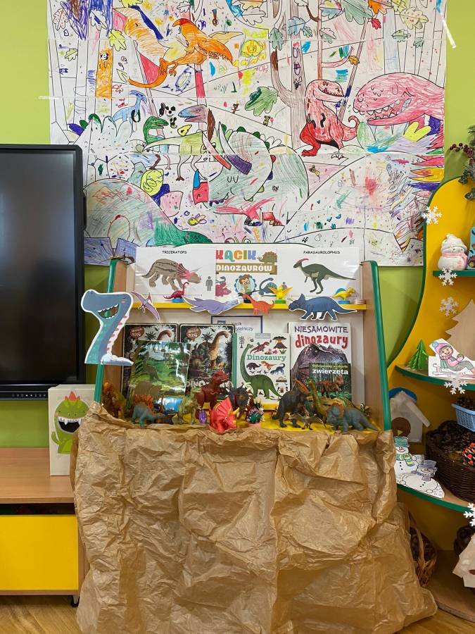? W dawnych czasach? to zdecydowanie najbardziej ciekawy dla nas temat. Pogłębiliśmy i tak szeroką wiedzę na temat Dinozaurów, a piosenka, którą o nich nauczyliśmy się śpiewać to niekwestionowany hit naszego przedszkola! Założyliśmy nawet kącik Dinozaurów, gdzie gromadziliśmy nasze kolekcje figurek, książek. Udawaliśmy poruszanie się Diplodoka, Prerodaktyla, Triceratopsa i Tyranozaura. Karmiliśmy ?Głodnego roślinnożerczego dinozaura? liśćmi ćwicząc przeliczanie. Było trochę kodowania. ( kto odgadnie jaki dinozaur nam się ukazał?). Dużo zagadek, układania, współpracy w grupie, stworzyliśmy też piękne prace plastyczne przedstawiające szkielety dinozaurów. To był super tydzień. --