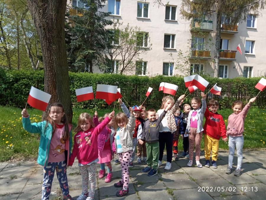 Dnia 02.05.2022r obchodziliśmy Święto Flagi. Aby uczcić ten ważny dzień, dzieci wybrały się na spacer wokół naszego ogrodu przedszkolnego z flagami oraz wzięły udział w sesji fotograficznej.