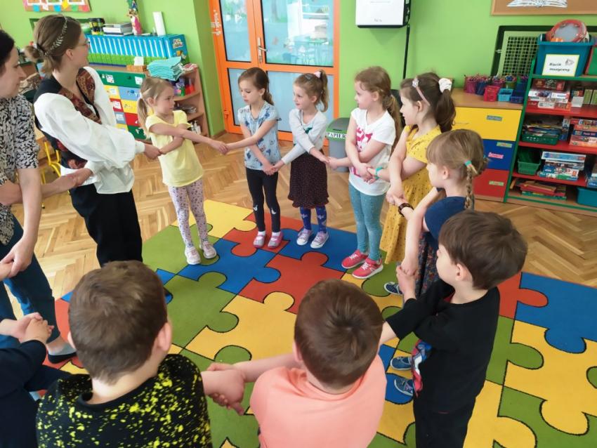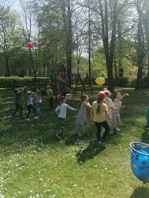 9 maja w grupie IV odbyły się kolejne zajęcia w ramach Projektu "Bajkowy Kraków w podaniach i legendach". Odwiedziła nas Pani Gabrysia Kongstad, która m.in. jest instruktorką ZHR. Z wykorzystaniem metodyki zuchowej zaprosiła nas na Bal na zamku królewskim. Dzieci podzieliły się na 3 grupy: "Bazyliszek", "Super poziomki" i "Ognisty tuptuś". Poznaliśmy zabawy dworskie np.: "Konie", "Smoki", "Hasanie po zamku", dowiedzieliśmy się kto mieszkał na zamku, a na koniec narysowliśmy ich portrety na mące:) Zabawa była fantastyczna, wykorzystaliśmy również sprzyjające warunki pogodowe i część zabaw zrealizowaliśmy na przedszkolnym tarasie.
