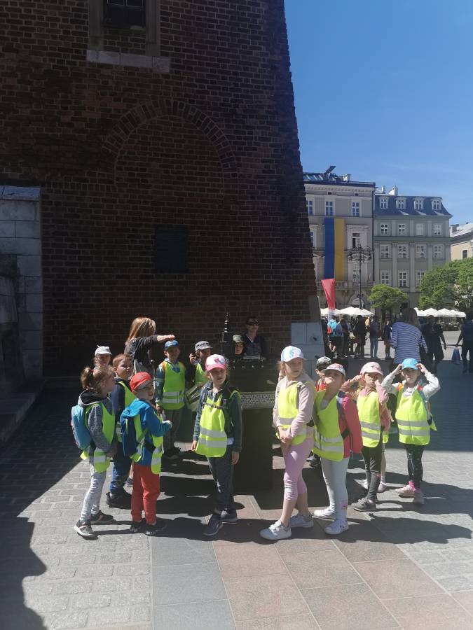19 maja grupa IV w ramach projektu „Kocham Kraków- podróż przez historię wehikułem czasu” udała się na wycieczkę szlakiem Legend Krakowskich. Nasz spacer z panią przewodnik rozpoczęliśmy od Barbakanu, Bramy Floriańskiej następnie ulicą Floriańską udaliśmy się do Rynku Głównego. Zatrzymaliśmy się, aby podziwiać jeden z głównych zabytków jakim jest Kościół Mariacki (poznaliśmy historię ołtarza Wita Stwosza) oraz Sukiennice i Wierzę Ratuszową. Na dziedzińcu Collegium Maius czekała na nas kolejna atrakcja – zegar z ruchomymi figurkami m.in. królowej Jadwigi, Władysława Jagiełły. W Ogrodzie Profesorskim zrobiliśmy sobie małą przerwę na posiłek przed dalszą część wyprawy. Plantami przeszliśmy na ul. Franciszkańską pod Okno Papieskie przedstawiające postać św. Jana Pawła II, a stamtąd pod Wzgórze Wawelskie Zamku Królewskiego. Na koniec oczywiście sprawdziliśmy czy Smok Wawelski nadal zieje ogniem….:) Podczas całej naszej wędrówki poznaliśmy mnóstwo legend związanych z naszym pięknym Krakowem i oczami wyobraźni mogliśmy się przenieść do tamtych czasów. To była bardzo ciekawa i pouczająca podróż w czasie…