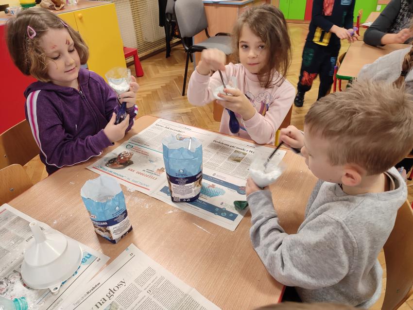 Kolejnym zadaniem projektowym było wykonanie przez dzieci gniotków sensorycznych. Te sensoryczne zabawki do ściskania, rozciągania są przyjemne w dotyku, ćwiczą palce i siłę nacisku. Pomagają w odstresowaniu się i poprawiają humor. Pod koniec zajęć dzieci opisywały swojego gumowego ludka i nazywały go. Nowa zabawka sprawiła dzieciom wiele radości i będzie wsparciem przy rozładowaniu negatywnych emocji.